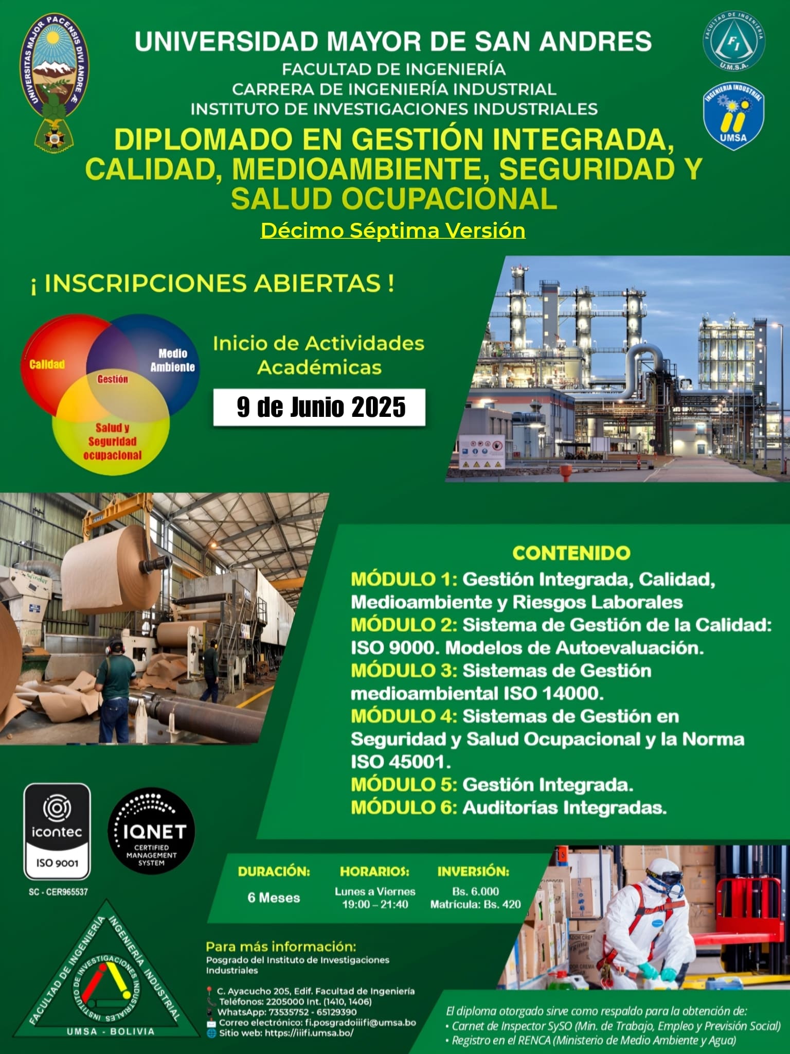 El Instituto de Investigaciones Industriales de la Carrera de Ingeniería Industrial de la Facultad de Ingeniería de la Universidad Mayor de San Andrés, iniciará actividades académicas de la Decimoséptima Versión del Diplomado en Gestión Integrada, Calidad, Medioambiente, Seguridad y Salud Ocupacional