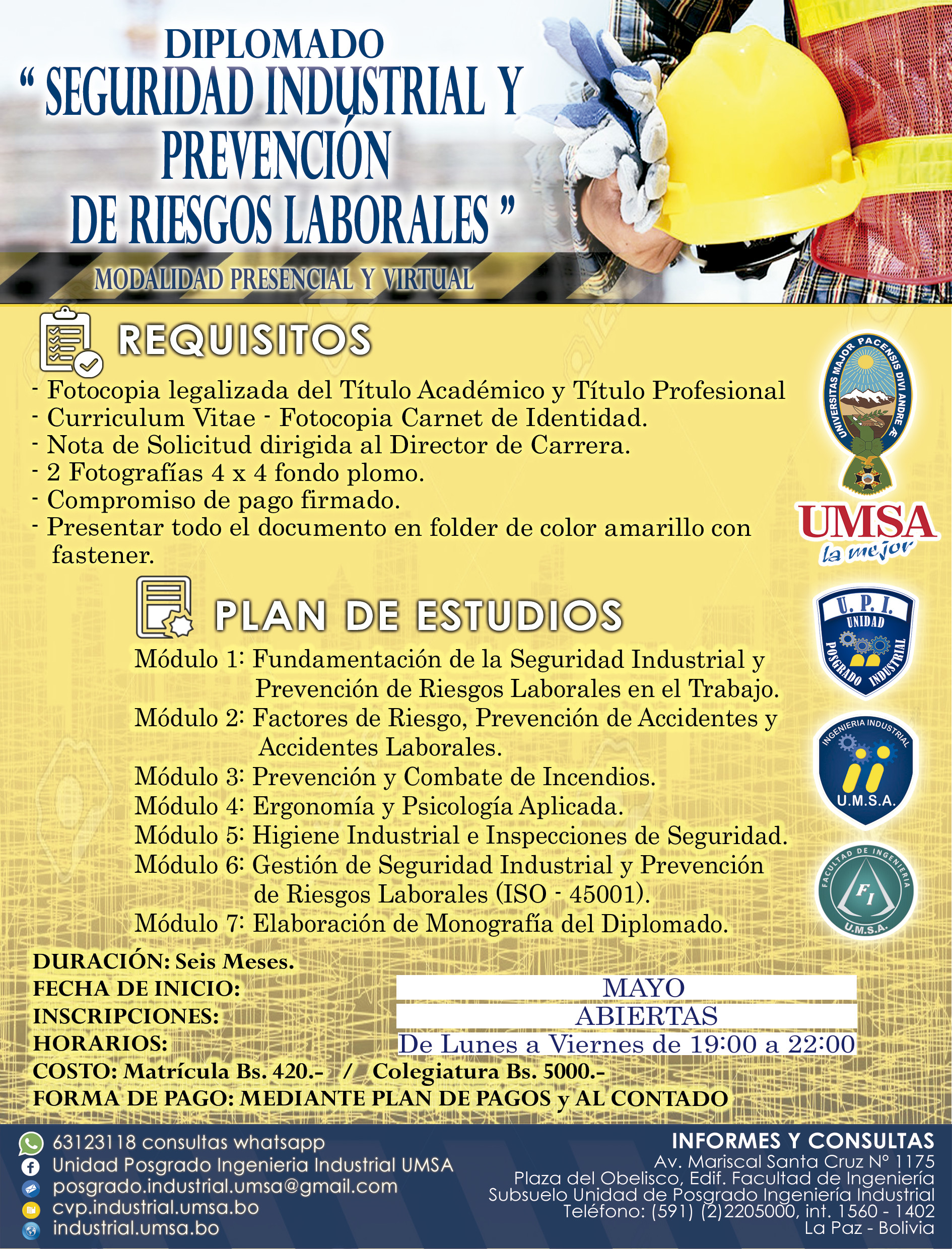 - Desarrollar competencias y valores que le permitirá operar los Sistemas de Gestión en Seguridad Industrial y Prevención de Riesgos Laborales, así como liderar los procesos de mejora continua, para el logro de objetivos de las instituciones públicas y privadas.